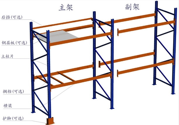 4、可以增加立柱護腳、防撞桿,防止叉車碰撞;為了層載更安全 還可在橫梁上安置橫梁擱擋、層板、網片跨梁等附屬設施。