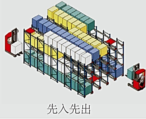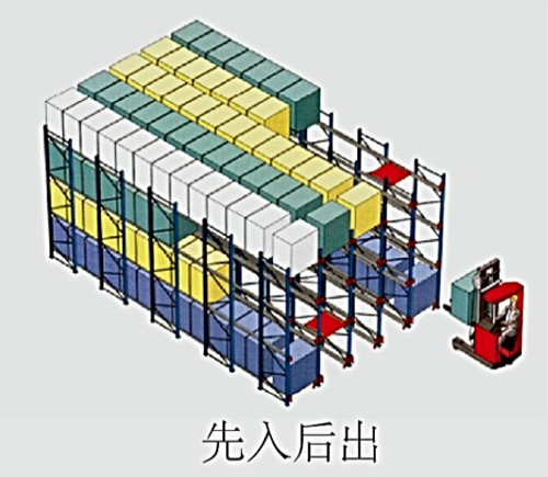 缺點:貨架兩端均需要布置叉車通道,動態儲存使用率低于后入先出,后入先出模式,僅在貨架單側布置叉車通道,貨物僅從巷道單側存取。