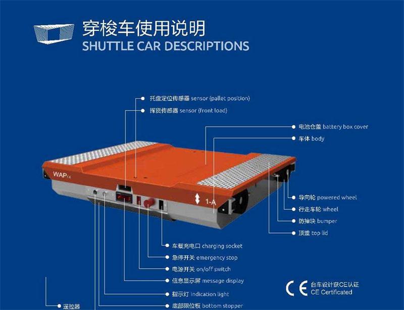 小車由無線電遙控,通過無線電遙控操作的穿梭車,可以承載托盤貨物在導軌上輕松運行;車載電池提供續航能力,主要依靠四個輪子前后行走。多個巷道可以共同用一部穿梭車。穿梭臺車的數量由巷道深度、貨物總量、出貨頻率等綜合因素來決定的。